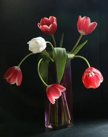 Rather than thinking of all this movement as a flaw, consider the dance of the tulips as a very special example of an ever-changing and ephemeral beauty. When the dance is done and the tulips have reached the end of their vase life, they don’t just fade but completely fall apart, shattering quite dramatically. It’s a diva of a flower, no doubt about it.