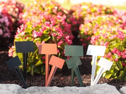 There are many types, improvised and purchased, that will do the job. Wooden markers tend to rot, plastic ones suffer from ultraviolet (UV) deterioration and metal markers are often pricey. BioMarkers, made from a patented material blending recycled plastic with corn cobs, are a new choice.
